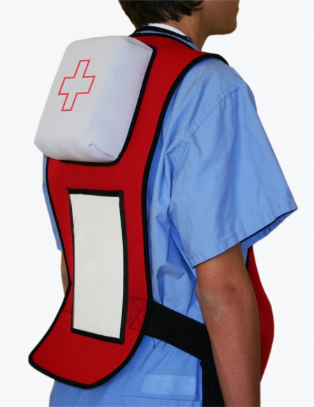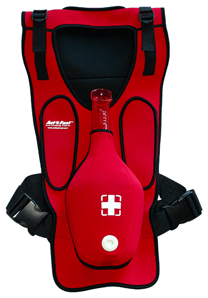 The ACT Fast anti choking trainer is a vest specially developed to practise the abdominal thrust (Heimlich) maneuver. The red ACT Fast anti chocking trainer is specially developed conform the ERC (European resuscitation council) guidelines. A student can use the ACT Fast to practise how to react when a victim is choking due a item in the air way. A unique made air blatter is attached to the front side, which can be filled with custom foam plugs, to practise the Heimlich maneuver. When the manoever is performed correctly and with enough power, the plug will shoot from the trainer. On the back side is a sap pad which allows the student to practise back blows between the shoulders, without heavy impact for the person that wears the trainer.