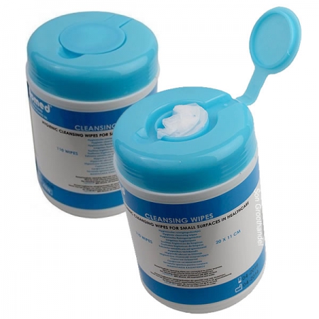 A container with 110 desinfection wipes to clean and desinfect CPR manikins. The wipes are 11 by 20 cm in size and can be easily taken from the dispenser individually.
