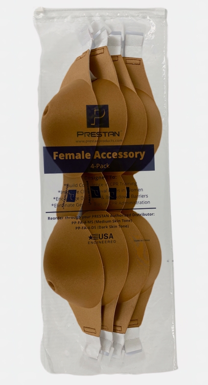 The PRESTAN Female Accessory has been designed to build confidence in CPR training, improve CPR survival rates in women, encourage dialogue & breakdown barriers, and eliminate gender bias in CPR administration. Securely fits both the PRESTAN Professional Adult/Series 2000 & Ultralite Manikins. Pair with the PRESTAN CPR Training Shirts for a full real-life training experience.