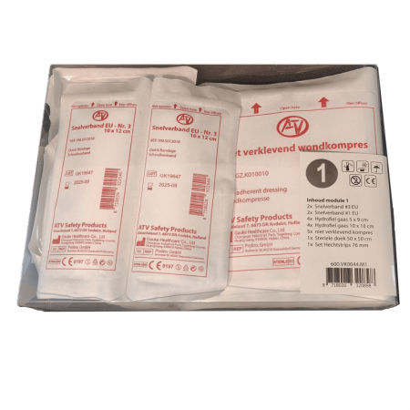 Module 1 with sterile bandages for the ATV emergency first aid kit. When you've only used some sterile products from the kit, you'll only have to replace module 1, causing that you save costs on the other materials. Module 1 Sterile, contains:
