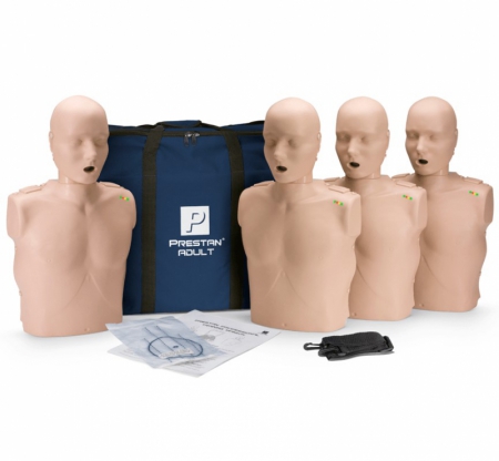 A package with 4 realistic looking Prestan adult CPR manikins to practise providing CPR in a convenient carrying bag. The Prestan CPR manikins contain the unique feedback system which gives the student feedback about the compression frequency en depth of the chest compressions.
