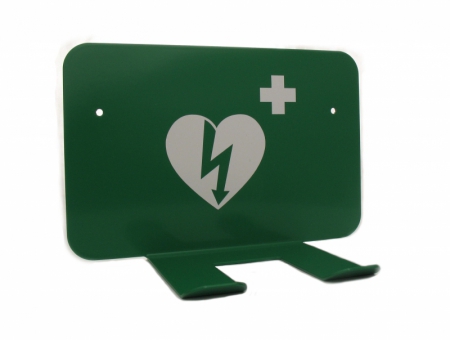 Universal green wall bracket provided with the international applicable AED ILCOR-logo. Easy to hang and suitable to use with every AED type.
