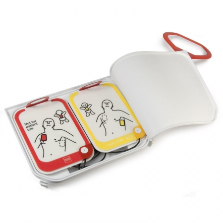 Eén set vervangende universele trainingselektroden in de tray voor de LIFEPAK CR2 AED trainer. De elektroden zien er hetzelfde uit als de echte CR2 elektroden en bevatten afbeeldingen van de locatie waar de elektroden op het lichaam geplakt dienen te worden. Net als de elektroden voor het echte AED apparaat zijn de trainingselektroden universeel. Deze kunnen dus gebruikt worden voor het oefenen van een reanimatie op volwassene en baby/kind-slachtoffers. De trainingselektroden kunnen gebruikt worden met ieder type reanimatiepop en zijn ongeveer 50 keer te gebruiken. De CR2 trainingselektroden zijn uitsluitend bestemd voor trainingsdoeleinden.